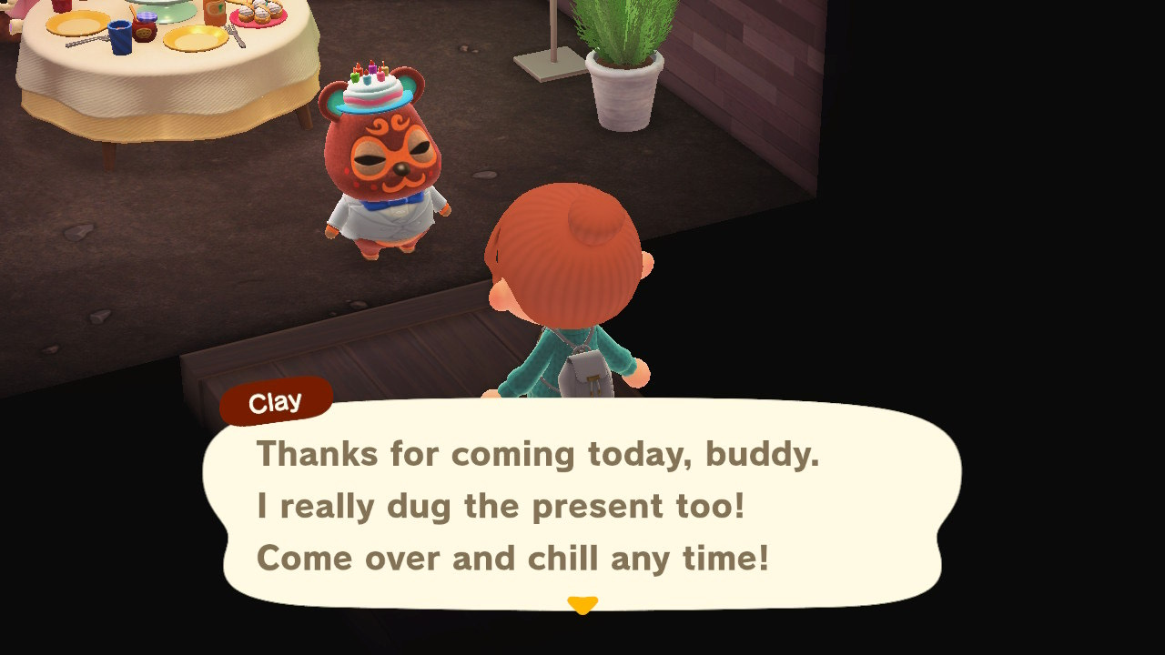 On Clay's birthday, I decide that not only am I going to remind my daughter to visit him, but I am going to do the same. He's overjoyed to see me even though I haven't seen him for ages. 'Where have you been?' he says. And I know that I'm not going to start playing New Horizons again: it feels 'done' to me. But giving him a quick visit lifts my day, and I'm glad I stopped by. It kind of feels like coming home.