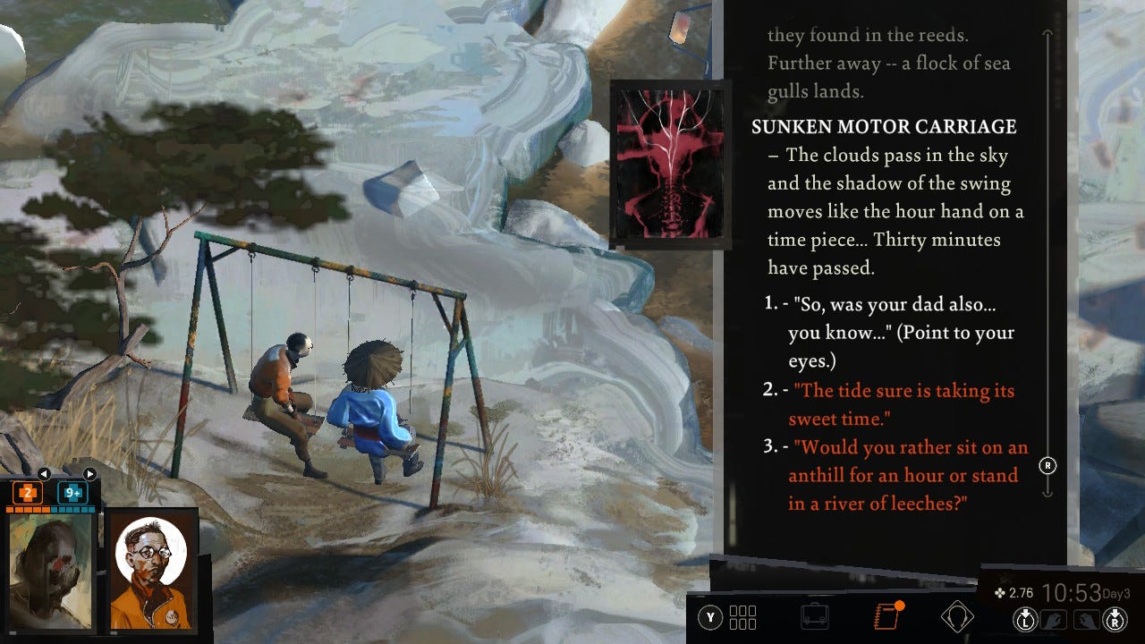 And then along came Disco Elysium. I only really got into it when I had a rare day off. I was soaking wet from the school run, and I had terrible cramps. I had an assignment that needed to be written. I got into my pyjamas, crawled into bed, and curled up with the Switch instead. There was no turning back from that moment: I was lost in Revachol, mysteries, dark humour, and unlikely friendships.