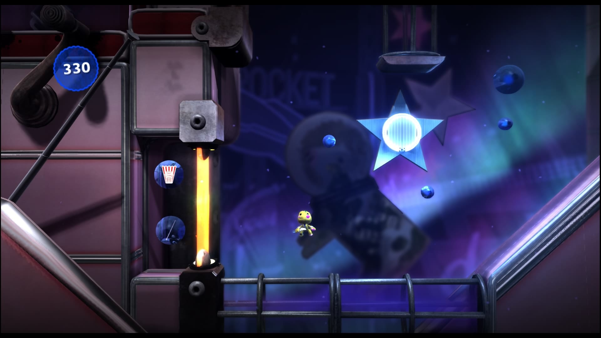 But I want to talk about one particular section of the game. Manglewood is a '50s-Hollywood-inspired world. I remember it as a dizzying, neon-lit world of pinball and diners and, I don't know, betrayal. And there's this one level called 'Deep-Space Drive-In'. In the background plays a particularly dreamy cover of the song I Only Have Eyes for You. When Sackboy is running around inside, the song plays crisply, but when he pops out to have a little swim through space, it becomes muffled, like you've just dipped underwater. Sort of like when you're about to drift off to sleep and you can feel your surroundings slipping away from you. I remember playing this level, sitting in the rocking chair, staring at Sackboy floating gormlessly in space until I started to lose focus, no longer sure what was real and what wasn't.