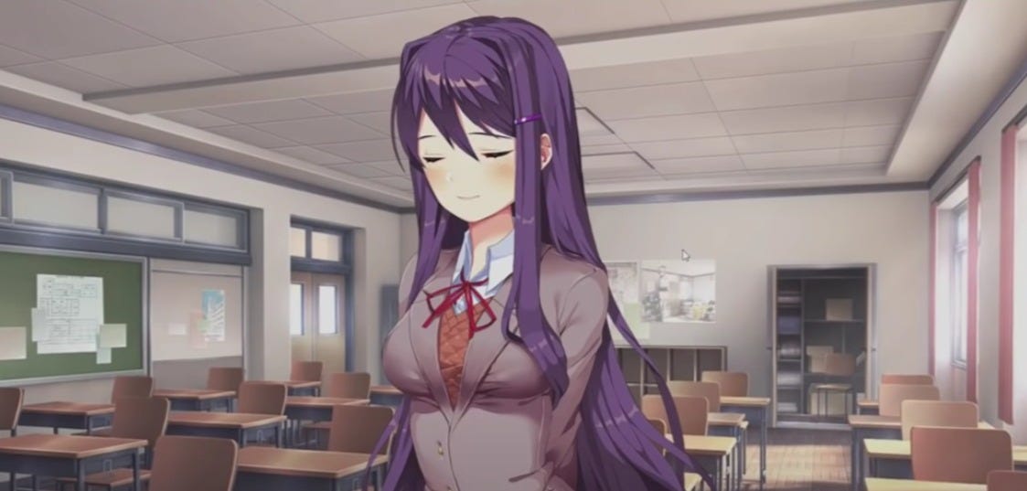 The first and most obvious example of this in a game is Doki Doki Literature Club. I'd never played a dating sim before Doki Doki, and I didn't know the twist. What starts as a (slightly tedious) story about a horny teenage boy on the pull at the literature club becomes something much darker.