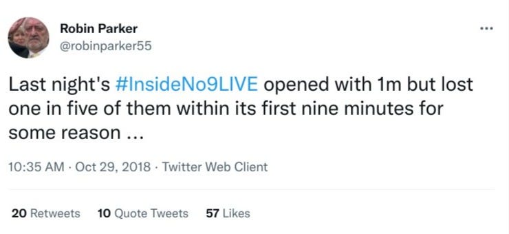 'I'm very sorry, but as you can hear, we're having a few problems at the moment with the sound for this live edition of Inside No.9 …' Apparently, this was so convincing that they lost a fifth of their viewers. Their loss, obviously.