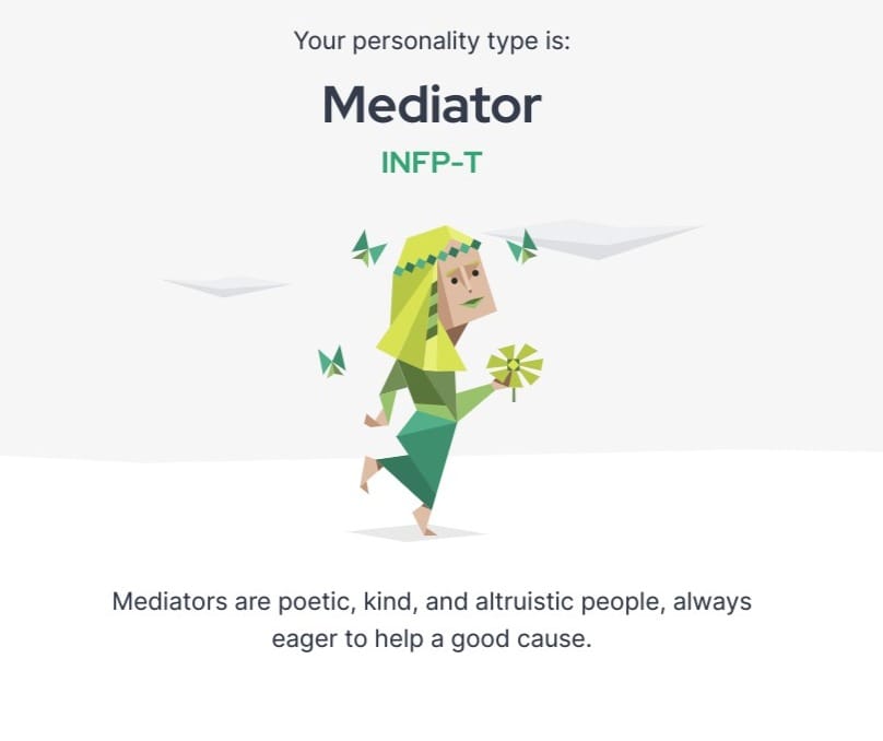 Everything I read made sense. The strengths, the weaknesses, and the reasoning behind my strange actions sometimes. Like the way I always leave things to the last possible second, the way I run away from conflict and doubt myself all the time. This is me: I am the mediator. I like making stuff and I don't like arguing. And I was probably right in that the modern world is not built for people like me, because mediators don't tend to easily slot into capitalism without at least feeling really pissed off about it.
