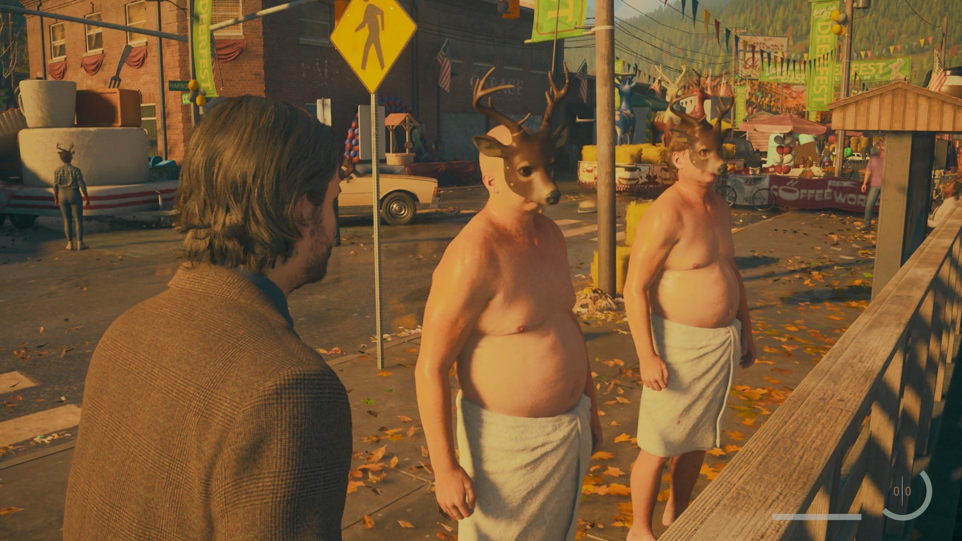There are real things that any artistic person has to deal with. Complete blockage. Excessive perfectionism. Rigid thinking. Alan Wake is the epitome of a man lost in the depths of his own mind. And on the other hand, in amongst this darkness and artistic, existential angst, there's lightness. Wandering through Bright Falls and hearing someone shouting randomly about Return: 'It's a commentary on juggling the responsibilities of motherhood and work!'. Alan's startled face and his huge, terrified eyes as he finds himself being interviewed by Mr.Door yet again. Saga shouting 'fuck, fuck!' during a serious fight.