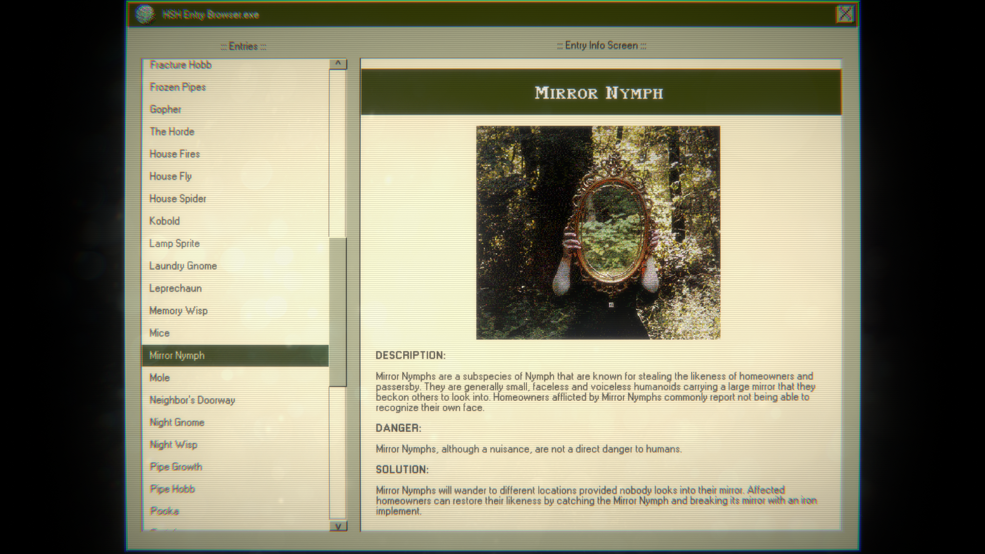 You're given a directory, which has mostly redacted entries to begin with. The more the management trusts you, the more entries you unlock. It's not really a twist; Home Safety Hotline gives the game away pretty quickly. You're not just dealing with carbon monoxide leaks anymore. Now, you're dealing with Dream Weavers, Lamp Sprites, Trolls, and Night Gnomes instead.