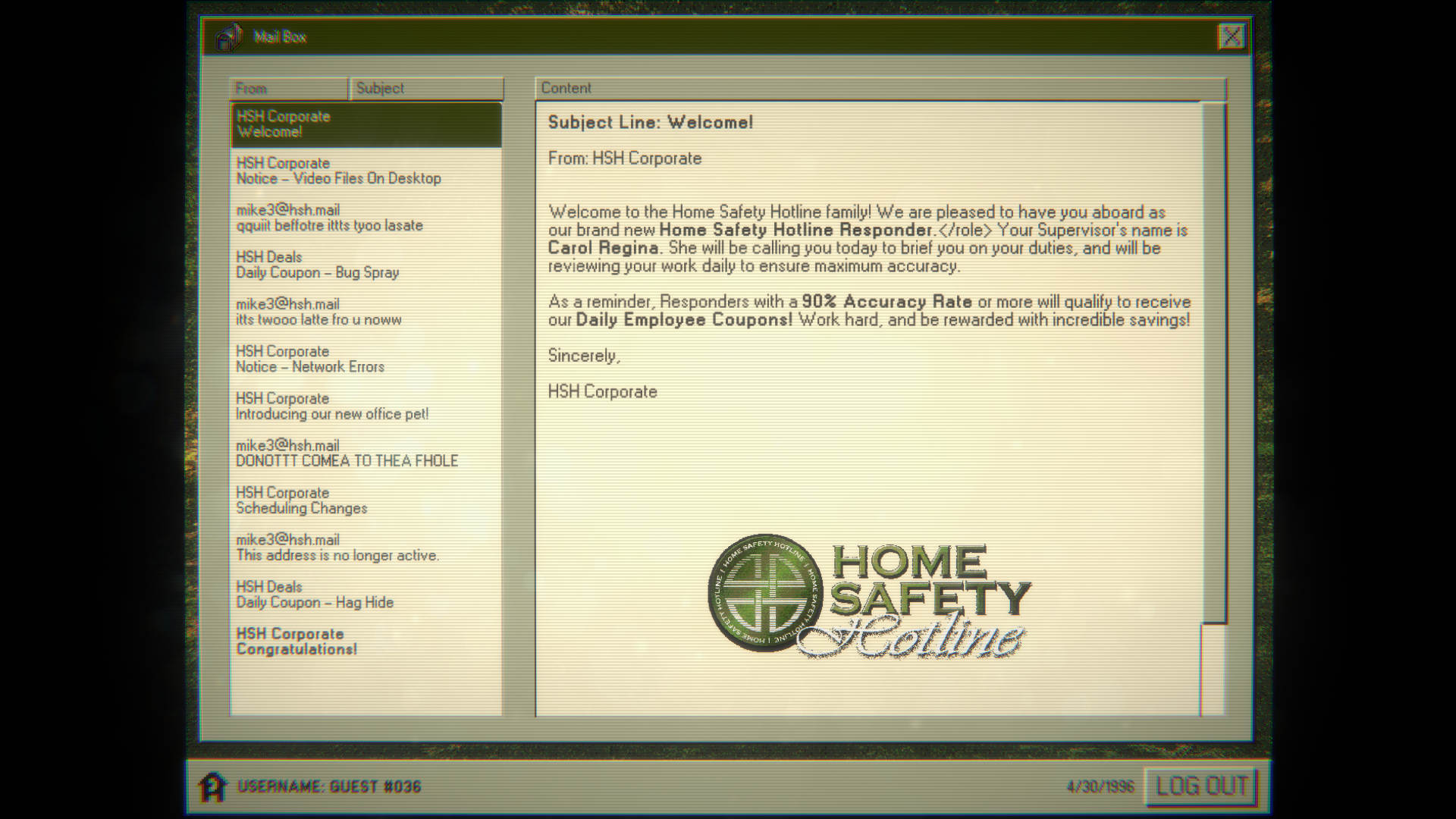 A plot unfolds. Emails start to pop up from an unknown source, suggesting that something is amiss with the company. Your manager, Carol, is a bit suss. It eventually escalates into something so wild I don't even think I could adequately describe it even if I wanted to, but it is certainly something to behold.