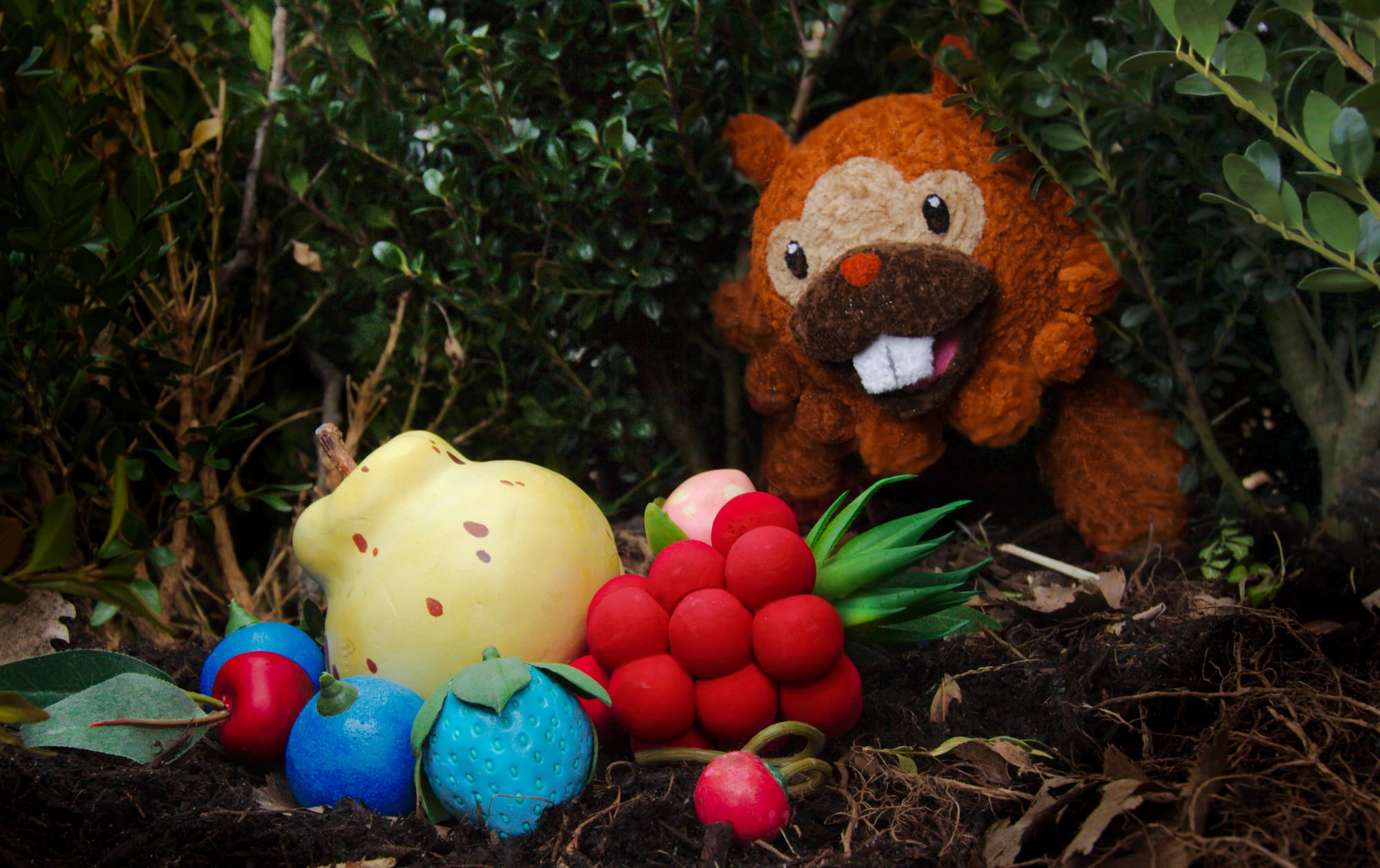 I'm so used to making pipe cleaner figures at this point that I can't earnestly say that any part of working on Bidoof itself was particularly difficult for me- the assembly is solid, the only points of articulation are the mouth and tongue. I'd say building the actual set was the challenge. I had a specific arrangement of evergreen shrubs I'd had in mind to frame Bidoof and the Berry pile, and I'm more than pleased with what I was able to put together.