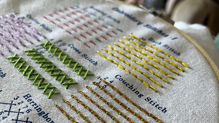 I've been learning embroidery. Slowly but surely, I'm learning all the stitches I need: back stitch, outline stitch, couching stick, blanket stitch. It's all coming along nicely. Once I've learned those, I can move onto the slightly more exotic ones, like feather stitches, or the very pretty French knot.