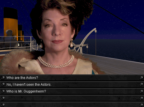 In Titanic: Adventure Out of Time, you can run around and explore the ship (without the pressure of preventing wars and dodging assassination) in Tour Mode. As you wander, you'll bump into some of the characters, but they'll serve you Titanic facts, photographs, and information about the people on board. It feels like a giant, floating museum of a ship that no longer exists intact. I watched an excellent video by Rotoscopester on the making of the game. The sheer amount of research it took to make this game is remarkable. Right down to finding an ancient swatch catalogue, so as to ensure colour accuracy despite having no colour photographs of the Titanic itself.