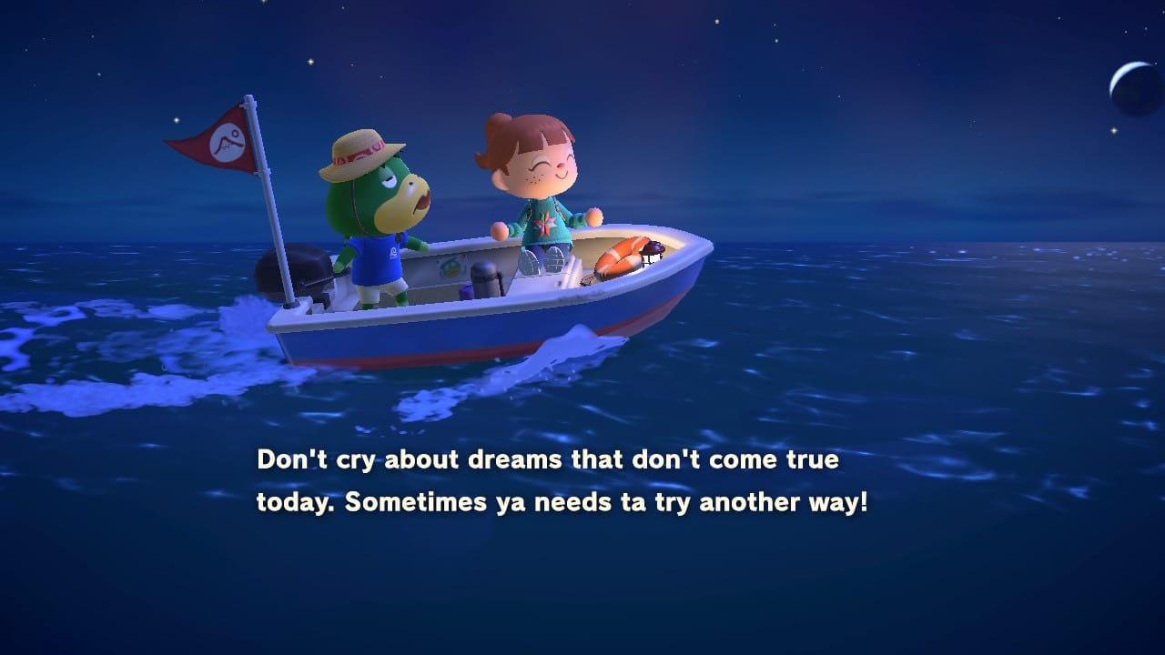 The thing is, Animal Crossing is packed with small pleasures. I'd forgotten. There are so many little things that make me feel happy: the stupid little puns when I catch fish or bugs. Opening my front door to see a random visitor standing outside. When Merry runs over to give me a gift (twice she gave me tiny sunglasses). When Flick comes to visit and gets mega excited about insects. Going on Kap'n's boat and listening to him sing. It's not dramatic or combative. It's not snarky. It's not fast-paced. It's just ... nice.