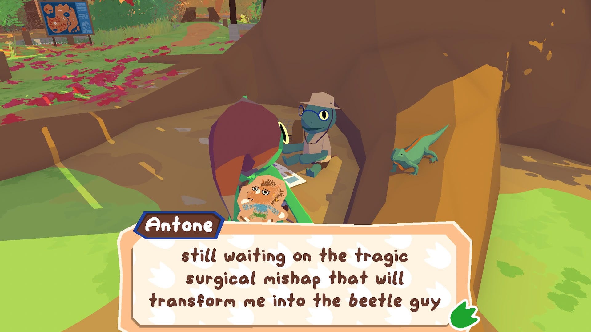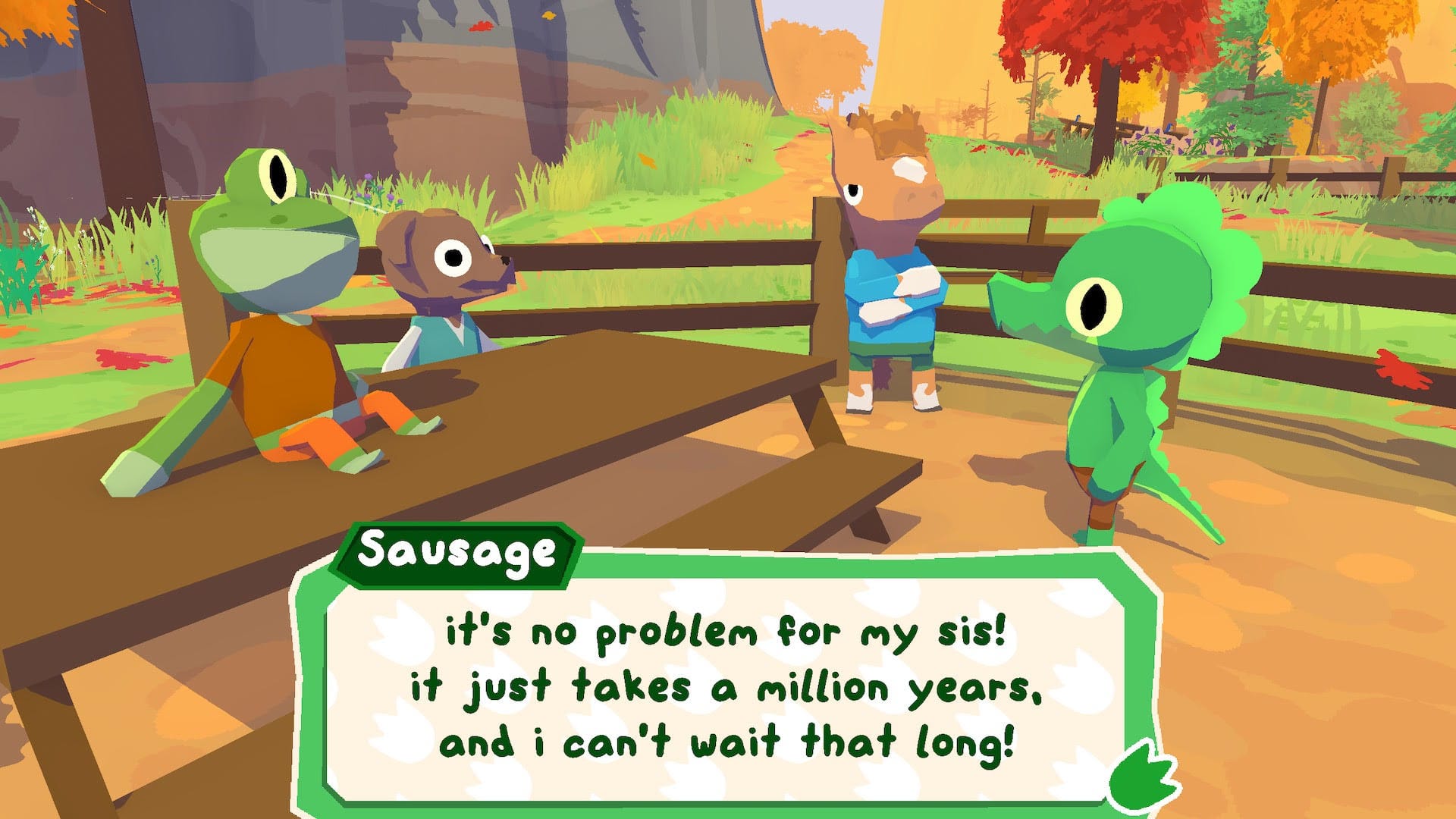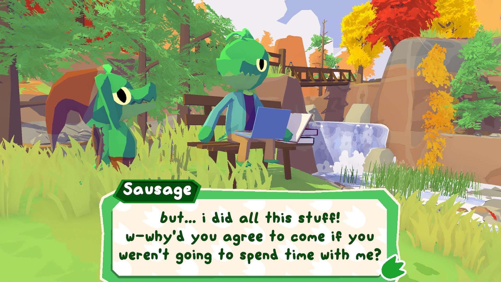 It starts like this: you (Lil Gator) spent your childhood playing in an incredible and strangely familiar fantasy world, invented by your best friend and sister. When Big Sis goes away to college, the game is put on hold. When she returns, Lil Gator (or Sausage, as I called them) is disappointed to see that she's kind of busy now. She's sitting on a swing, busy on her laptop, trying to focus on an assignment. Lil Gator, with their kid logic, decides that she must have just forgotten how fun the game is. A quest starts: if Lil Gator can gather up their friends and make the game look really fun, maybe she'll ditch all her grown-up stuff and play with them.